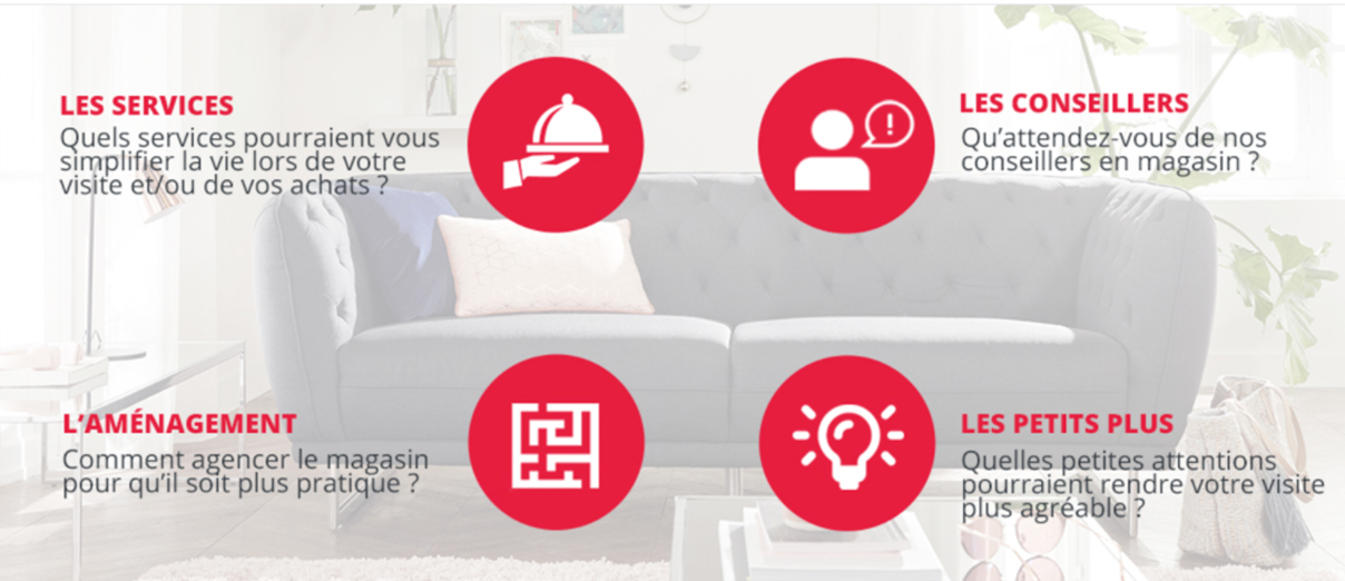 Les magasins de mobiliers et d’électroménagers sont plus difficiles à agencer puisqu’ils présentent de nombreux produits de tailles plus ou moins importantes. L’adaptation aux attentes en terme d’aménagement reflète un réel enjeu pour faciliter le déplacement dans les magasins de la marque, ou choisir des produits. Même si la mise en oeuvre de nouvelles idées pourrait s’avérée complexes en terme de mise en oeuvre, des remontées d’irritants récurrentes pourraient bien faire ressortir de nouvelles attentes communes de la foule sur ce plan.