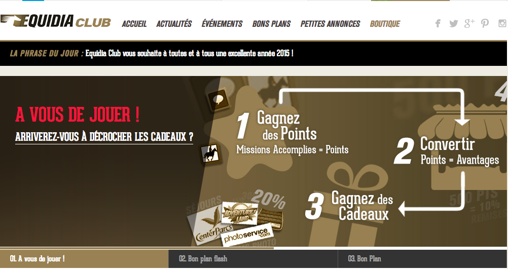 Nespresso veut par le biais de cette communauté virtuelle inciter sa clientèle à partager leurs informations de consommation de café avec eux. Le club compte aujourd’hui près de 10 millions de membres et ne finit pas de s’agrandir. La marque redouble d’effort (invitations, mailing, questionnaires..) poour prouver à ses membres qu’ils sont les ambassadeurs de la marque ! . Equidia Club : Pour avoir accès à tous les privilèges offerts par ce club, il suffit de partager son nom, prénom et mail. Ensuite le membre découvre une communauté dédiée au monde du cheval (jeu, équitation).