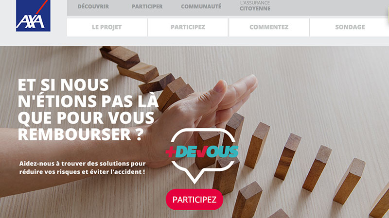 Voici un cas de co-création dans l’assurance particulièrement intéressant. AXA a lancé il y a plus d’un an un programme collaboratif baptisé “Mon Assurance Citoyenne”, permettant aux clients de la marque de s’exprimer sur différents sujets, tester des concepts, ou imaginer de nouveaux services avec la marque. Pour son 6ème projet collaboratif, la marque lance un débat on-line sur la prévention : “ET SI AXA N’ÉTAIT PAS LÀ QUE POUR VOUS REMBOURSER ? “.