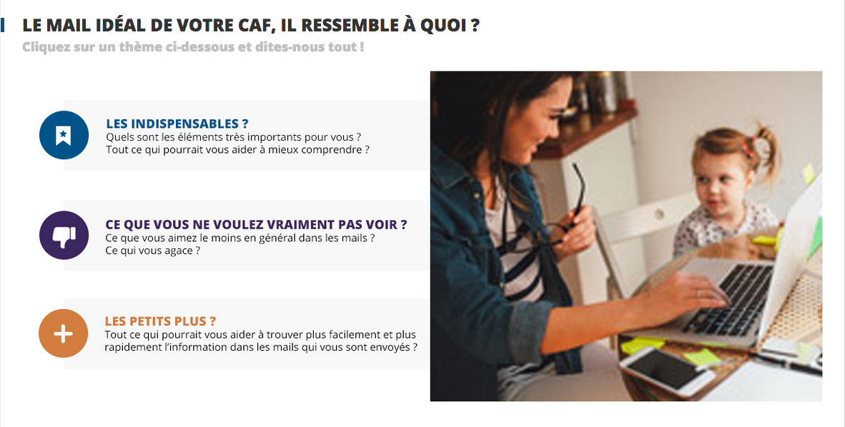 C’est ainsi qu’un premier projet a récemment vu le jour, orienté autour d’une problématique et un enjeu majeur pour l’institution : la meilleure manière de rentrer en contact avec ses allocataires par le canal mail. Y est présenté très concrètement le template d’un mail type jusqu’ici réalisé vs un nouveau modèle imaginé par les équipes de la CNAF. L’idée est simple : comprendre ce qui plait, ce qui plait moins, les zones d’ombres ou bien au contraire ce sur quoi capitaliser. Fond et forme y sont traités et cela à travers une dynamique de questionnement à deux vitesses : des questions à portée qualitative et d’autres plus quantitatives. Une cartographie d’inspiration permet ainsi de lever de grandes questions tels que les indispensables attendus, au contraire ce qu’ils ne veulent vraiment pas voir, ou bien encore les petits plus.