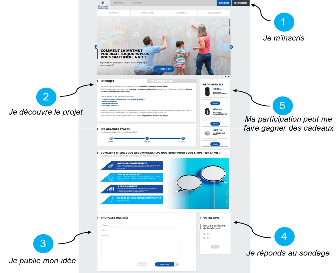 Le premier projet participatif lancé sur le LAB Matmut porte sur un sujet d’idéation pure. Il s’agit d’impliquer un premier vivier de sociétaires et de les engager dans une dynamique communautaire sur la plateforme pour comprendre leurs besoins et leurs attentes. Cette première prise de parole s’inscrit dans une démarche exploratoire et vise à construire une première base communautaire, et à faire émerger des idées et des insights sur de nouveaux produits et/ou services. La question centrale posée aux sociétaires est « Comment la Matmut pourrait toujours plus vous simplifier la vie ? ». Le questionnement a été organisé en quatre grandes thématiques : les assurances, les services, les moments de vie, et les petits plus qui changeraient la vie des sociétaires.