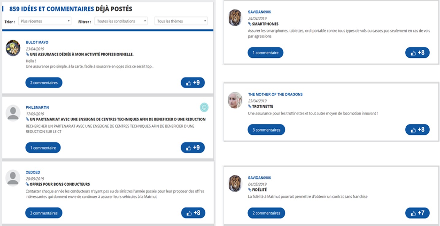 Grâce à une interface simple et ludique, les sociétaires s’inscrivent en moins de deux minutes. Pour participer, ils peuvent poster des idées, « liker » ou commenter les idées des autres participants, et répondre à des sondages. Ce qui leur permet de cumuler des points et d’augmenter leurs chances d’être tirés au sort et de remporter les récompenses à la fin de chaque projet participatif. Pour inciter les sociétaires à co-créer, il faut bien entendu les encourager à s’investir. Le LAB Matmut intègre une mécanique de gamification pour motiver la participation. Ainsi, plus les sociétaires contribuent sur la plateforme plus ils gagnent des points et plus ils augmentent leurs chances de remporter les récompenses mises en jeu. Les récompenses mises en jeu ne sont pas les seules motivations à co-créer. Il peut être question de récompense honorifique voire altruiste ou d’ordre social comme interagir avec les membres de la communauté, se sentir au cœur du développement d’une innovation, contribuer à l’avenir de l’Assurance, renforcer ses connaissances sur un sujet, dialoguer avec la Matmut… font également partie des raisons pour lesquelles les sociétaires peuvent s’engager dans une démarche de co-création. De cette manière, la Matmut crée un dialogue permanent avec ses sociétaires et construit un lien de proximité avec eux. En ce sens, la co-création permet d’affiner la connaissance des sociétaires grâce aux outils de la plateforme qu’elle met à disposition des co-créateurs pour favoriser le partage d’outputs créatifs. C’est aussi une manière d’éviter l’attrition (perte des clients) en donnant la parole aux sociétaires qui participent directement à l’innovation de la Matmut. En montrant l’intérêt pour leurs idées, la Matmut les responsabilise et les fait participer à construire l’Assurance de demain et à développer certains de ses produits et services. Si la co-création permet de concevoir des produits au plus près des clients, elle peut ainsi s’avérer être un outil efficace pour étudier son marché.