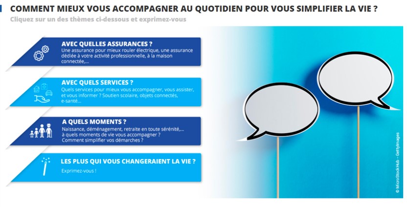 Afin d’améliorer l’expérience client, la Matmut invite ses sociétaires à participer à la création des produits et services de demain à travers sa plateforme participative « le LAB Matmut ». Le LAB Matmut permet d’impliquer les sociétaires sur différentes étapes de la réflexion couvrant le cycle de l’innovation : >Idéation : pour faire germer de nouvelles idées d’offres ou de services. >Co-conception : pour impliquer les sociétaires dans la conception d’une offre, des parcours clients de demain. >Bêta-test : pour faire tester un nouveau service en avant-première et l’ajuster selon les retours d’expérience. >Amélioration & fidélisation : pour collecter l’avis des sociétaires sur un produit ou un service existant afin de le faire évoluer et l’adapter davantage à leurs besoins.