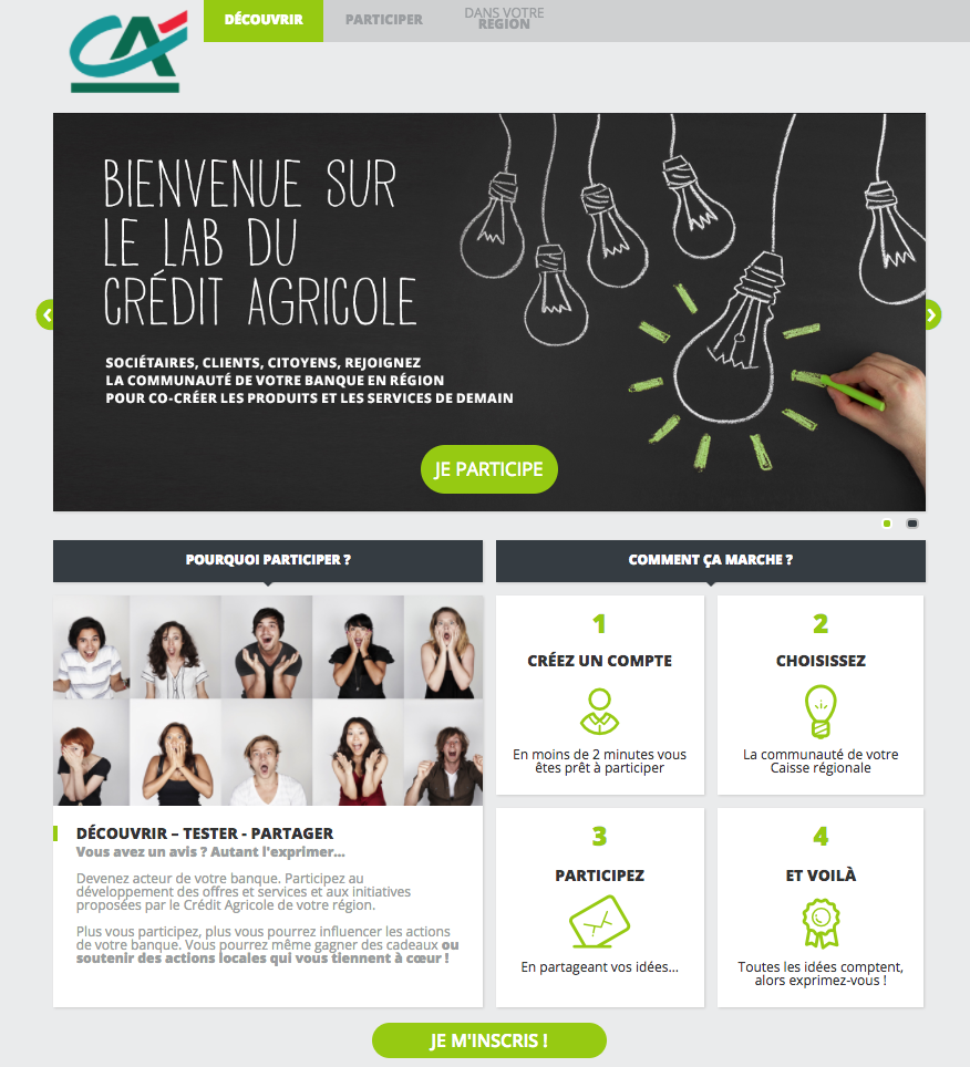 Et si il y avait des milliers d’idées en régions pour améliorer la banque ? C’est le pari qu’a fait le CRÉDIT AGRICOLE en lançant il y a un peu plus d’un an le projet “CA-Lab”, une plateforme communautaire qui propose aux clients de la marque de participer à ses projets d’innovation. Et le CA-Lab bouillonne ! En effet, cette plateforme participative mise en place en collaboration avec la startup Fanvoice, spécialiste de la co-création, est devenu un véritable lieu de discussions et de co-innovation entre les caisses régionales du groupe et les clients de la marque. La plateforme a déjà séduit une dizaine de caisses régionales qui se sont lancées dans l’aventure ou préparent un projet…