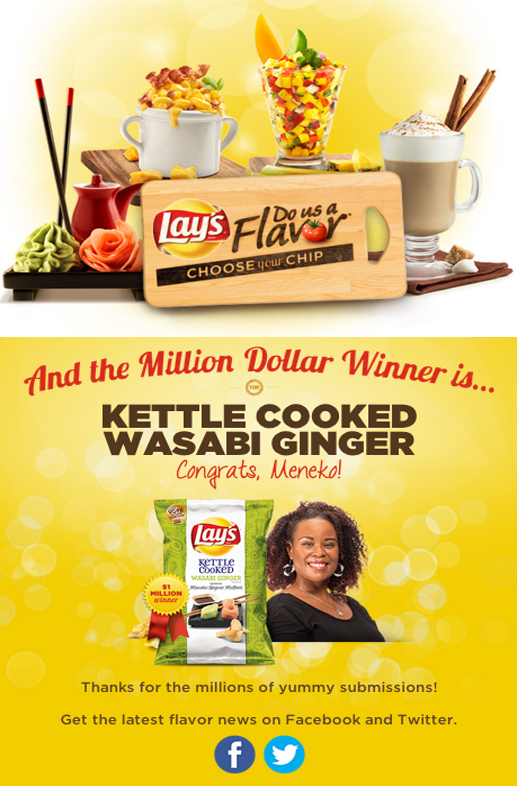 Pour la deuxième année consécutive, la marque Lay’s lance son concours intitulé « Do Us a Flavor ». Elle invite les utilisateurs à créer leurs propres parfums de chips, puis à voter pour leur favori. Le gagnant de la saveur la plus plébiscitée a non seulement le privilège de voir son produit commercialisé mais reçoit aussi la coquette somme d’1 million de dollars ! (Seriously ???) A la fois originales et bizarres, les propositions des fans ont créé le buzz autour de la campagne, qui a connu un grand succès grâce aux nombreuses parodies imaginées.