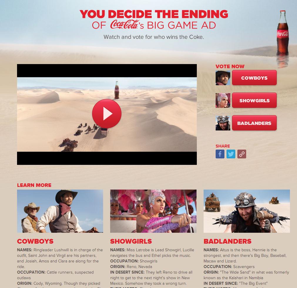 Coca-Cola a lancé cette année et pour la seconde fois, une campagne marketing télévisée durant le Super Bowl. En plus du traditionnel spot télévisé diffusé pendant le célèbre événement sportif américain, la compagnie de soda a aussi mené une campagne en ligne : « Coke Chase », dans laquelle trois équipes – des Cowboys, des danseuses de revues de Vegas, et des personnages de Mad Max – étaient en compétition pour une course dans le désert afin de gagner une bouteille de Coca géante. Les fans sont invités à voter en ligne pour leur équipe favorite ou pour « saboter « une équipe adverse en semant d’embuches leur chemin. Les actions des fans à travers les différents réseaux sociaux (Facebook, Twitter, Tumblr, YouTube et Instagram) déterminent quelle sera l’issue du scénario de ce sport publicitaire. Et c’est justement la stratégie de Coca-Cola, renforcer l’engagement de ses fans à travers leur implication.