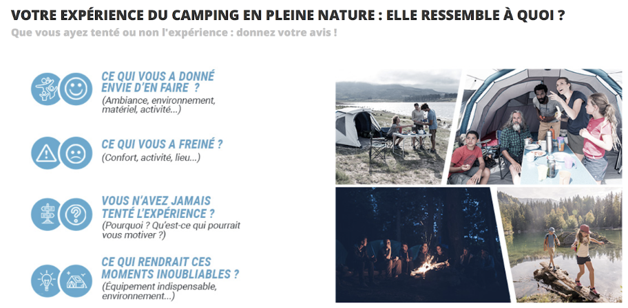 Réinventer une chaise, une table de camping, ou bien encore co-créer un haut de Fast-Hiking pour permettre à ses utilisateurs de gagner toujours plus en confort et en performance : voici certains objectifs que s’est assignée l’enseigne en se lançant dans ce type d’initiative. Des objectifs ambitieux, rendus possibles autour d’un dispositif séquencé qui au cumul de toutes les initiatives la marque portées sur FANVOICE, a permis de générer pas loin de 4 000 idées et commentaires. Une matière inestimable au service de l’innovation utile. En s’adressant à ses clients MOUNTAIN, autour d’une question chapeau relevant presque de la suggestion : « Et si on parlait camping en pleine nature ? », la marque s’est volontairement placée dans un cadre extrêmement large. Il s’agit là du point de départ. Et tout l’enjeu est de fédérer un maximum de personnes autour du projet collaboratif mis en ligne pour créer un noyau communautaire fort et ré-adressable dans un second temps.