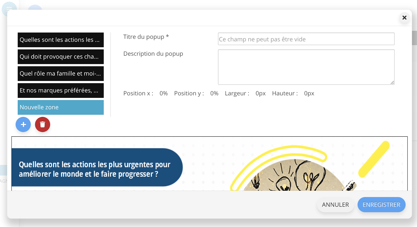 Les administrateurs peuvent implémenter en toute autonomie leur cartographie d’inspiration, directement depuis le dashboard (back-office) et définir les zones cliquables des différentes thématiques.