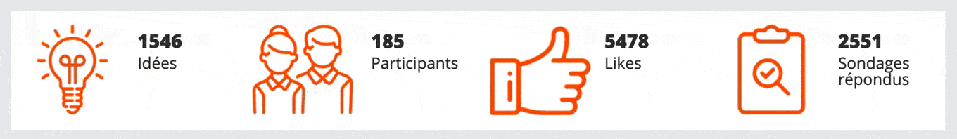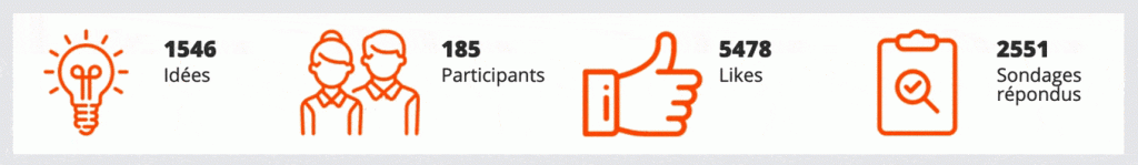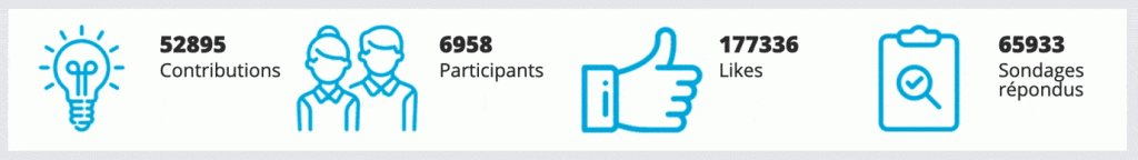 Sur plusieurs de nos plateformes, nous avons mis en place un compteur live qui fait apparaître de manière animée et en temps réel, le nombre de contributions, de participants, de sondages répondus et de likes.