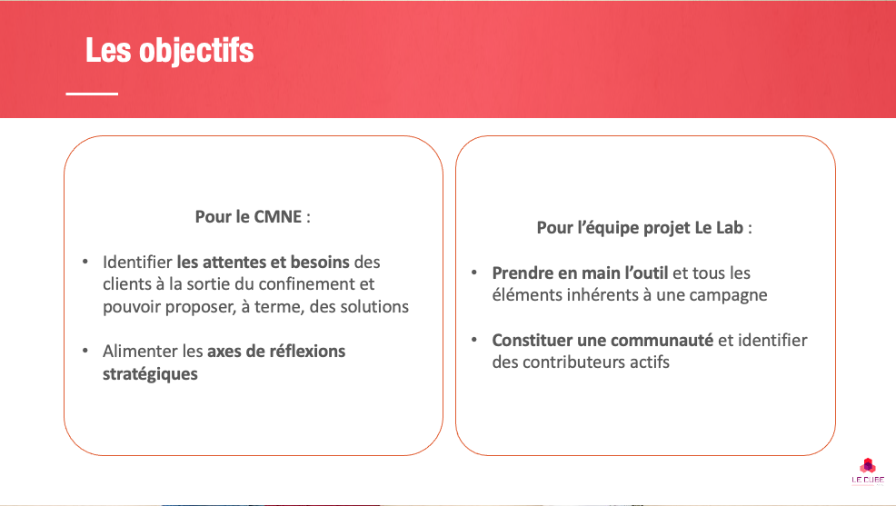 Pour cette campagne, les objectifs sont double : > identifier des nouvelles attentes et alimenter les axes de réflexions stratégiques, > prendre en main l’outil et constituer le noyau communautaire qui sera recontacté par la suite.