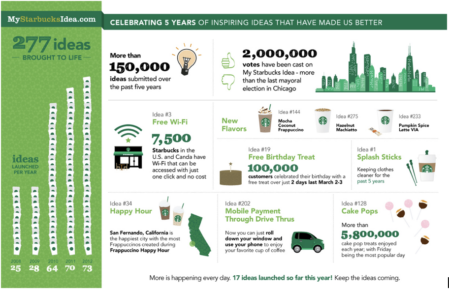 De nombreuses marques emploient la gamification dès les premières étapes de la création d’une communauté et poursuivent l’effort dans la durée sur une plateforme web : les consommateurs sont invités à participer à des concours d’idées pour imaginer de nouvelles offres en collaboration avec la marque. Quand les membres de la communauté répondent à un quiz, ils nous en disent plus sur leurs attentes, quand ils postent un avis ou un commentaire, ils créent un contenu qui peut en faire réagir d’autres dans une approche vertueuse et gagnant-gagnant : le membre très actif a plus de chances d’être récompensé et s’il ne l’est pas, au moins, il aura eu la satisfaction de partager son avis pour se faire entendre (ce qui n’est pas toujours facile avec les grandes marques quoiqu’on en pense). De plus, plusieurs membres s’exprimant sur un même sujet donnent plus de résonance à leur voix (ou plus de points à une idée avec laquelle ils sont d’accord). Si les produits de la marque sont plus adaptés à leurs attentes personnelles, au final, les clients y gagnent. Alors bien entendu, partant de ce postulat, on peut se poser la question de la récompense “physique” associée au jeu. Faut-il vraiment envoyer mettre en jeu un iPad ou un Prize Money, ou peut-on se contenter d’un badge digital sur son profil ? Le cadeau physique est-il vraiment indispensable ? Pas forcément. Utile ? Indéniablement ! Plus la marque est une “love brand”, moins il est indispensable d’envisager des rétributions (mais cela reste très conseillé), en revanche nous avons pu constater que plus le sujet d’un projet participatif était compliqué ou associé à un secteur d’activité peu “trendy” ou “entertainement” aux yeux des consommateurs (assurance, banque, services publics…), plus la gamification facilitait les approches de recrutement et d’animation. Le cas de Starbucks avec sa communauté digitale « My starbucks Idea » est un vrai cas d’école : après un démarrage basé sur le simple partage de feedbacks sans cadeaux, la marque il a mis en place un concours d’innovation pour réaliser un gobelet 100% recyclable via des cumuls de points, des challenges et des récompenses.
