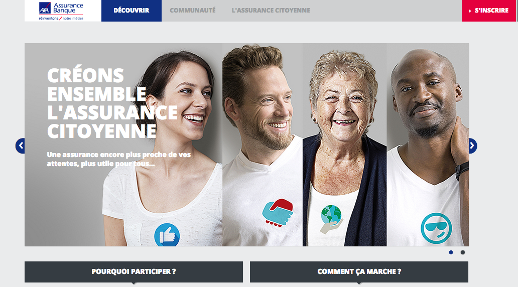 La démarche s’est concrétisée à l’international, puisqu’AXA a lancé en 2014 le projet “Start-in”, une plateforme d’innovation participative destinée à ses 161 000 salariés dans les 59 pays où il est installé. Un programme ambitieux et doté d’importantes ressources à en juger par les détails donnés au Journal du Net dans une interview de Frédéric TARDY, en charge de la stratégie digitale chez AXA. Cette année, la marque a d’ailleurs élargit sa démarche à l’innovation participative avec des clients, à travers son site www.monassurancecitoyenne.com (powered by Fanvoice).