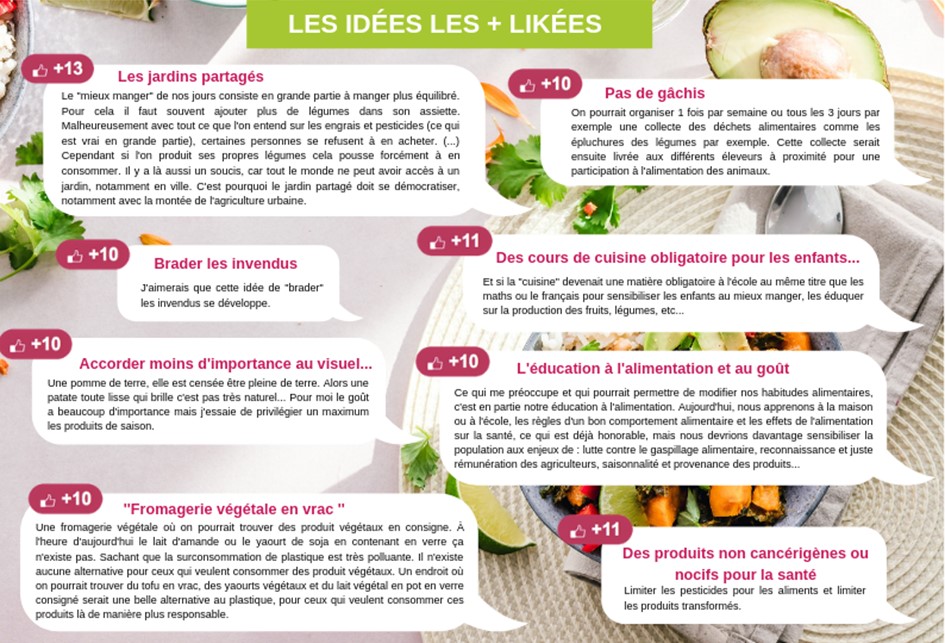 Dans le cadre d’un projet d’innovation visant à construire un système alimentaire durable dans les prochaines années, le Groupe SEB et la FoodTech en partenariat avec la Métropole de Dijon souhaitent innover avec une approche d’écosystème en mettant le consommateur au centre de la décision et de la collaboration avec les bons acteurs (citoyens, startups, entreprises, chercheurs, etc). Ce projet vise à construire une première base communautaire et à faire émerger des idées de nouveaux produits et services digitaux pour accompagner les consommateurs dans leur alimentation, à partir du moment où ils achètent leurs produits bruts jusqu’au moment où ils les cuisinent en fonction de leurs besoins, préférences et régimes. C’est dans ce contexte que le Groupe SEB et la FoodTech ont lancé une campagne d’idéation sur la plateforme FANVOICE. L’appel à idées a été construit autour d’une question centrale posée « Mieux manger, et si on en parlait ? ». Le questionnement a été organisé en cinq grande catégories : la signification du « mieux manger », ce qui compte le plus, ce qui est préoccupant, les services qui simplifient la vie, et les contributions pour mieux manger demain.