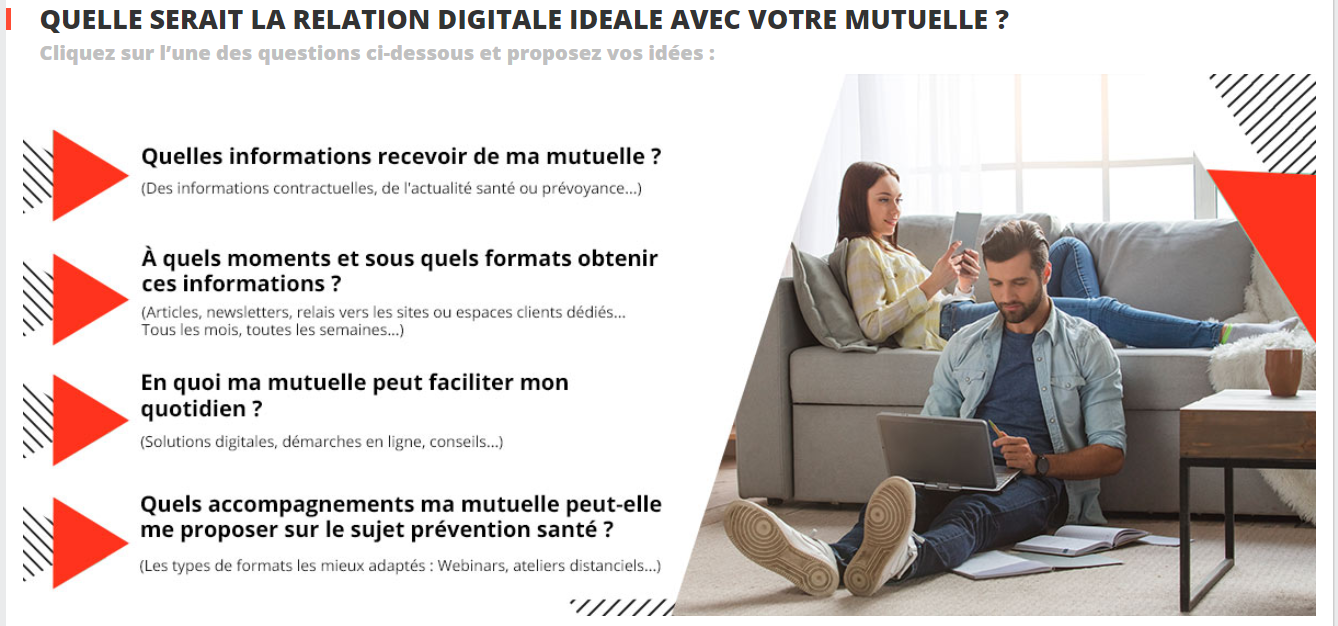 À partir de mi septembre 2020 et pendant 3 mois, Malakoff Humanis invite ses clients et le grand public à venir exprimer leurs idées pour imaginer ensemble la relation digitale idéale avec sa mutuelle : quelles communications, solutions et services digitaux pour un accompagnement au quotidien ? Cet échange s’articule autour de 4 thématiques de réflexion, et un questionnaire complémentaire. Les participants qui le souhaitent peuvent également s’inscrire pour poursuivre l’aventure avec la marque, et tester dans quelques mois, en avant-première, les nouveaux Webinars Prévention Santé de Malakoff Humanis.
