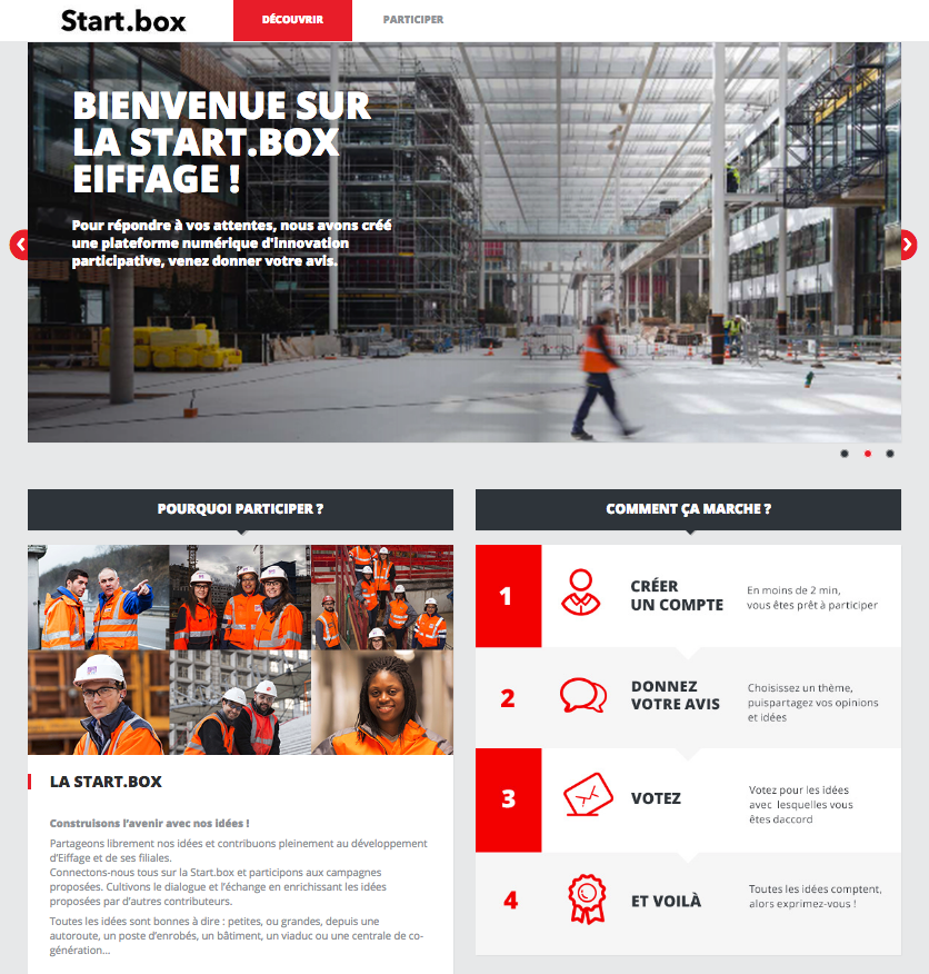 Eiffage, groupe international du BTP, composé de 65 000 collaborateurs répartis dans le monde entier, du siège aux chantiers, a lancé une démarche d’écoute au travers d’une plateforme d’innovation participative interne, intitulée, la « Start.box ». La volonté du groupe est ambitieuse : créer un carrefour de dialogues et d’échanges pour l’ensemble de ses collaborateurs, mais également pour les clients et partenaires du groupe. Le but est d’être à leur écoute de et construire l’avenir de l’entreprise avec leurs idées innovantes, en Les sollicitant à l’occasion de campagnes régulières aux thématiques bien définies qui leur offrent une vraie liberté de parole.