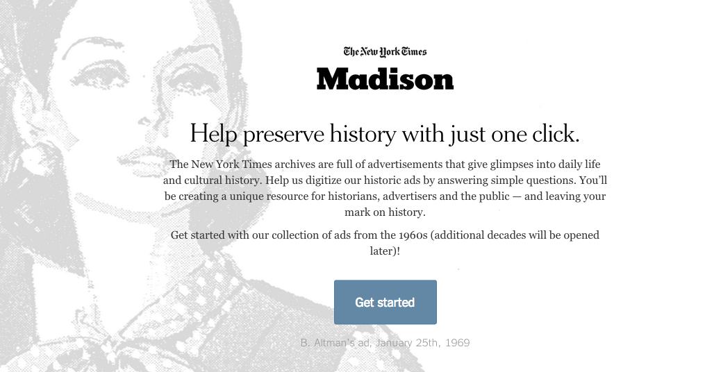 Le New York Times a lancé un appel à l’aide aux bénévoles qui accepteront de se pencher sur les publicités contenues dans les éditions des journaux des années 60. L’énorme base de données qui en résultera sera accessible aux historiens et au public. Les contributions aideront les recherches et différents projets à l’intérieur comme à l’extérieur du New York Times pour les années à venir. Au-delà de renforcer la fidélité de ses lecteurs en leur permettant de découvrir et de participer à l’observation des archives du célèbre journal, la plateforme Madison pourrait être impliquée dans le service des ventes publicitaire du Times. D’après Mme Lloyd, un des résultats possibles à l’issue de cet archivage serait peut- être de construire de nouveaux produits publicitaires. Refusant de rentrer dans les détails, cette dernière admet tout de même que « Les marques sont clairement très intéressées par leur propre histoire ». En parallèle, les éditeurs du New York Times ont aussi créé une plateforme modulable, flexible et de type open source afin de développer leurs futurs projets et outils de crowdsourcing.