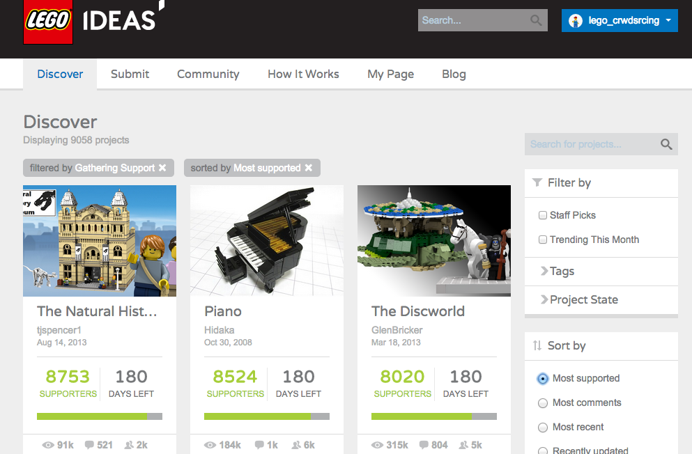 Sur la plateforme de co-création Lego Ideas, les fans et créateurs les plus inspirés peuvent soumettre au public leurs idées de toutes sortes pour la création de kit Lego. Il suffit pour cela de se créer un compte Lego Ideas, et de proposer son idée. Les réalisations qui obtiennent un minimum de 10 000 votes sur une durée d’un an maximum sont analysées par Lego qui décidera si le projet peut être commercialisé ou pas. Il est même possible pour les membres âgés de 13 à 18 ans de soumettre des projets mais une autorisation parentale est requise pour un passage éventuel en phase de review.