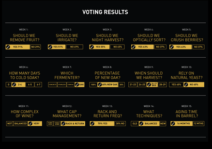 Juan Muñoz-Oca est le vigneron en chef ; lui et son équipe devront tout au long du processus suivre les indications des utilisateurs pour produire cette cuvée 2014 de Cabernet Sauvignon. Ils poseront à leurs fans toutes les questions d’ordre technique auxquelles ils ont l’habitude de répondre en interne. Et d’après M. Muñoz-Oca, « Tout ce que nous indiquera la foule, nous nous engageons à le faire. »